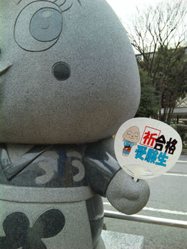 「祈合格受験生」と書かれたうちわを持った、JR浦和駅前のうなこちゃん像も